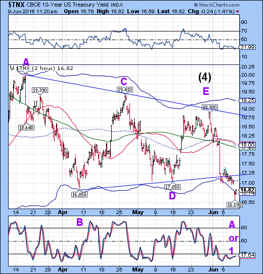 VIX appears to be consolidating between its 50-day Moving Average at 14.50 and its 2-hour mid-Cycle resistance at 14.73. It also left an open gap at 14.00 and doesn’t appear capable of filling it. These gaps, by the way, are indicators of a third wave in action.
